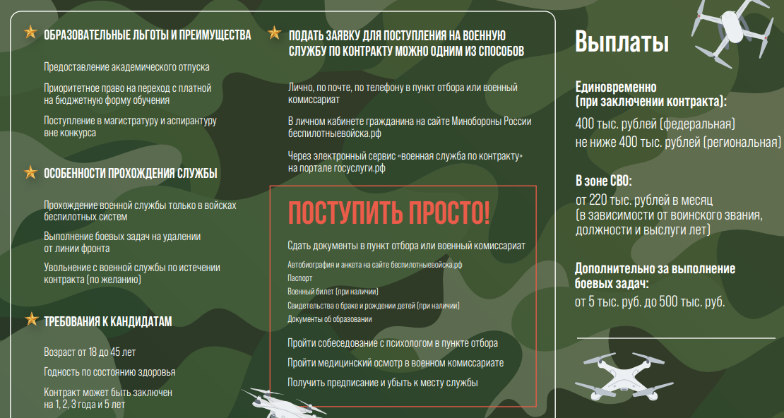 Дополнительно информируем, что для заинтересованных студентов предусмотрена возможность записи на военную службу по контракту в войска беспилотных летательных аппаратов.